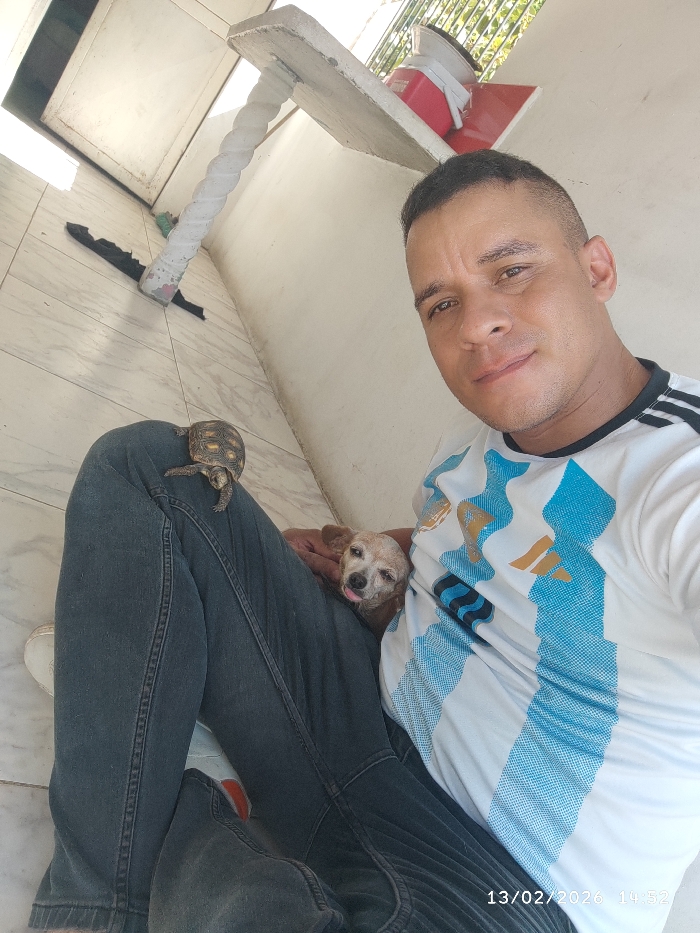 A man sits with an Argentine soccer jersey, dark jeans, and white shoes. On his left leg, a small tortoise crawls. Tucked beside him, near his waist, is a small, tan-colored dog with its tongue slightly sticking out. The background features a tiled floor, white walls, and a glimpse of greenery outside. A small, white table with a twisted leg is visible in the upper-left corner. The date "13/02/2026" is printed on the bottom-right.