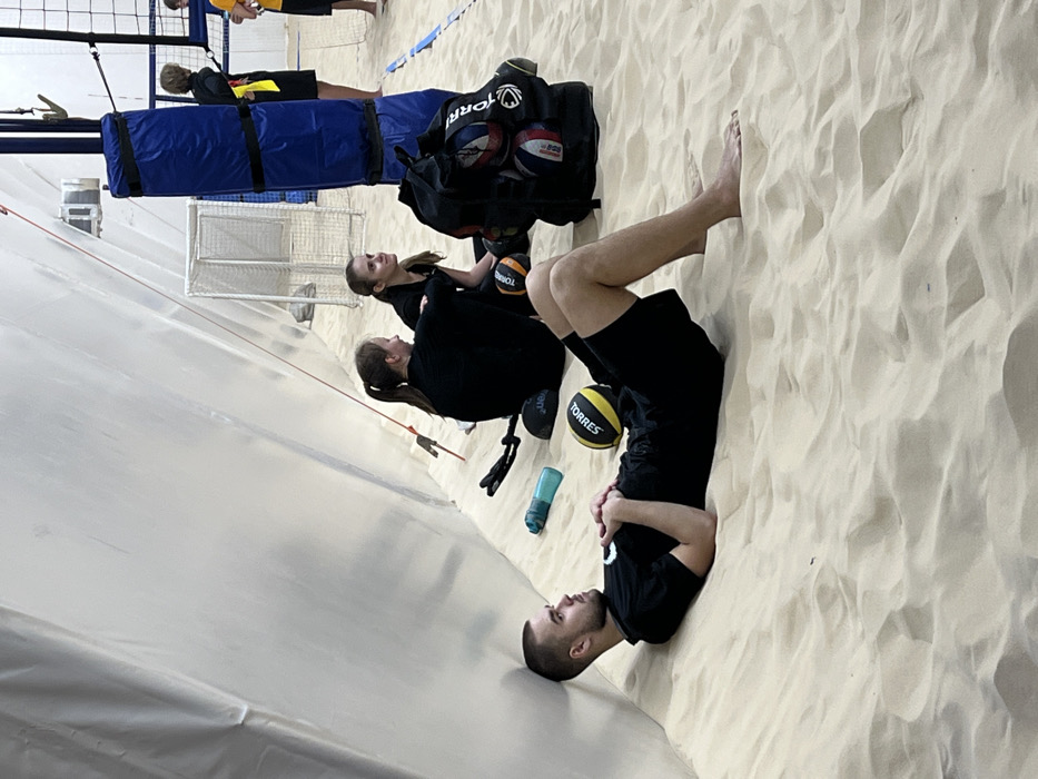 People in black clothing sit on a sandy beach, with legs outstretched. One man is at the front, with two women sitting behind him. A sports bag filled with balls sits behind the women, near a blue pad, which appears to be against a wall. A white net stands slightly in front of the pad. A blue water bottle and a black and yellow ball are on the sand next to the man. A volleyball net is visible above them, and the scene appears to be indoors.