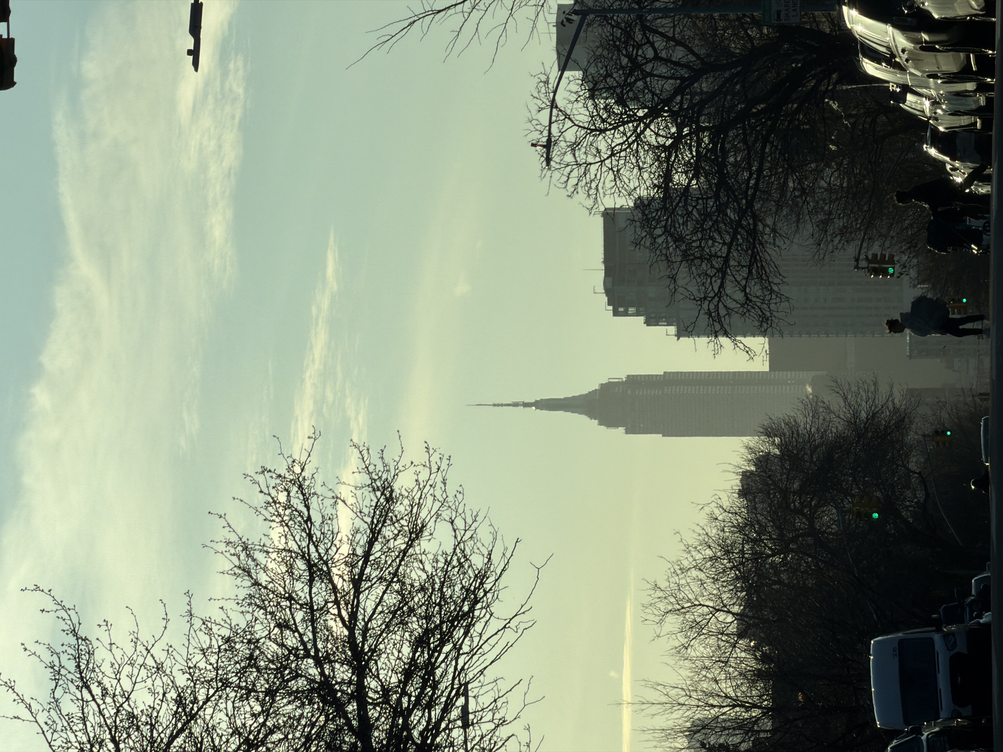 The image depicts a cityscape in New York City, USA, possibly Manhattan, with the Empire State Building visible in the distance. The foreground is filled with bare trees in silhouette, suggesting winter or early spring. On the right side of the frame, there's a row of parked cars, and pedestrians are seen crossing the street at a crosswalk, with traffic lights indicating "walk". The sky is pale and overcast, with some cloud cover. The image is slightly tilted.