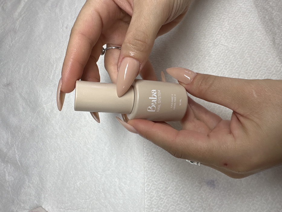 The image displays a close-up view of two hands holding a bottle of nail product against a white, textured background, likely within the city of Kafr Kasim, Israel. The hands are manicured with long, pointed nails coated in a light beige polish. The right hand wears a silver-colored ring with a clear stone on the ring finger, and the left hand has a plain silver-colored ring on the pinky finger. A small red mark or scab is visible on the back of the left hand near the thumb. The product bottle is light beige with a matching cap, labeled "Buba NAIL SYSTEM." Below the brand name, the label specifies "TPO FREE X" and "HEMA FREE X," followed by "16 ML" at the bottom. The hands are positioned to showcase the bottle, holding it upright. A blurry pink object is partially visible in the upper left corner of the background.