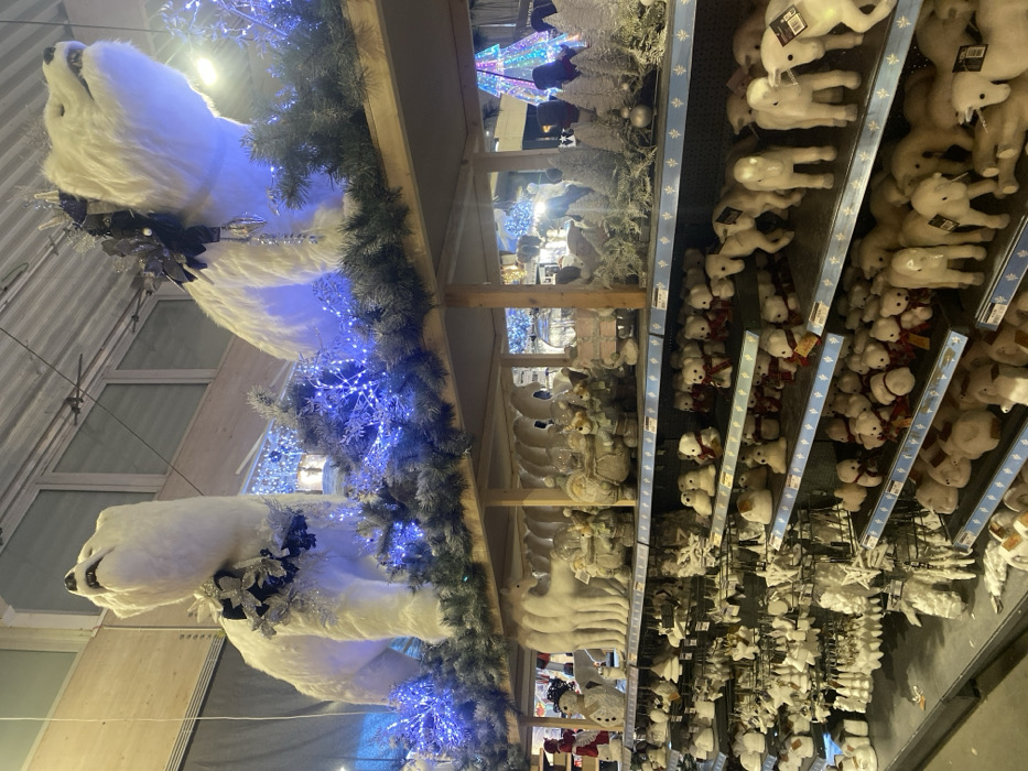 The image depicts an indoor retail environment, likely a seasonal display, located in a commercial establishment in Mouscron, Belgium. The scene is dominated by Christmas or winter-themed merchandise arranged on multi-tiered shelving units. Two large, white, faux fur polar bear figures are positioned on the uppermost shelf. The polar bear on the left stands with its head raised, mouth open, wearing a dark-colored collar adorned with silver, star-like elements. The polar bear on the right is in a similar posture, head raised, wearing a dark collar with dangling silver accents. Both figures are situated amidst artificial green pine garlands interwoven with bright blue string lights. Behind them, obscured by blue illumination, a large, conical, multi-colored light display is visible. The upper wall features light-toned horizontal paneling and windows, with an industrial-style ceiling above. Below the polar bears, several rows of merchandise are displayed on gray shelving with light blue trim. The immediate shelf below features multiple identical white reindeer figurines, followed by various white and silver decorative objects including glass cloches containing miniature scenes, rustic-textured figurines of Santa Claus and other figures, and groups of small white artificial Christmas trees. The lower shelves are densely packed with smaller items. One section contains numerous small, white plush teddy bears, many adorned with red scarves or bows. Another section displays rows of hanging white ornaments of various designs, including stars, bells, and boot shapes. Further along, rows of white, possibly ceramic or resin, unicorn or stylized horse figures are visible. No specific individuals are clearly identifiable or engaged in distinct actions within the primary frame. Blurred figures are visible in the distant background, suggesting the presence of people within the wider retail space. The floor appears dark, possibly concrete or a similar industrial material. The overall lighting is bright, supplemented by the decorative blue lights throughout the display.