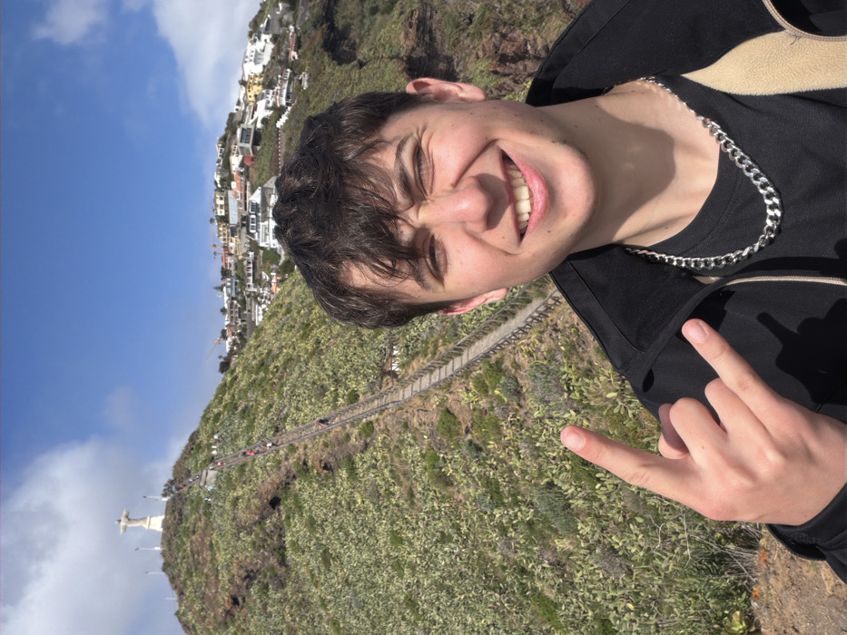 A forensic examination of the image reveals a young male in the foreground, positioned to the right of the frame. He has short, dark hair and light skin, and is smiling broadly with his eyes partially closed. He wears a black collared jacket over a black t-shirt, accessorized with a silver-colored cuban link chain. His right hand is raised, performing the "rock on" gesture with the index and pinky fingers extended. The background displays a steep, rocky hillside covered extensively with green Opuntia cacti (prickly pear). A long wooden staircase with railings ascends the hillside towards its summit. Several individuals are visible on this staircase, appearing to ascend towards a prominent white statue of Christ, known as Cristo Rei, situated at the peak. This location is identified as Caniço, Portugal. To the mid-right of the background, a cluster of multi-colored residential buildings is visible on an adjacent lower hillside. The sky above is clear and blue with scattered white clouds, indicating a bright, sunny day.