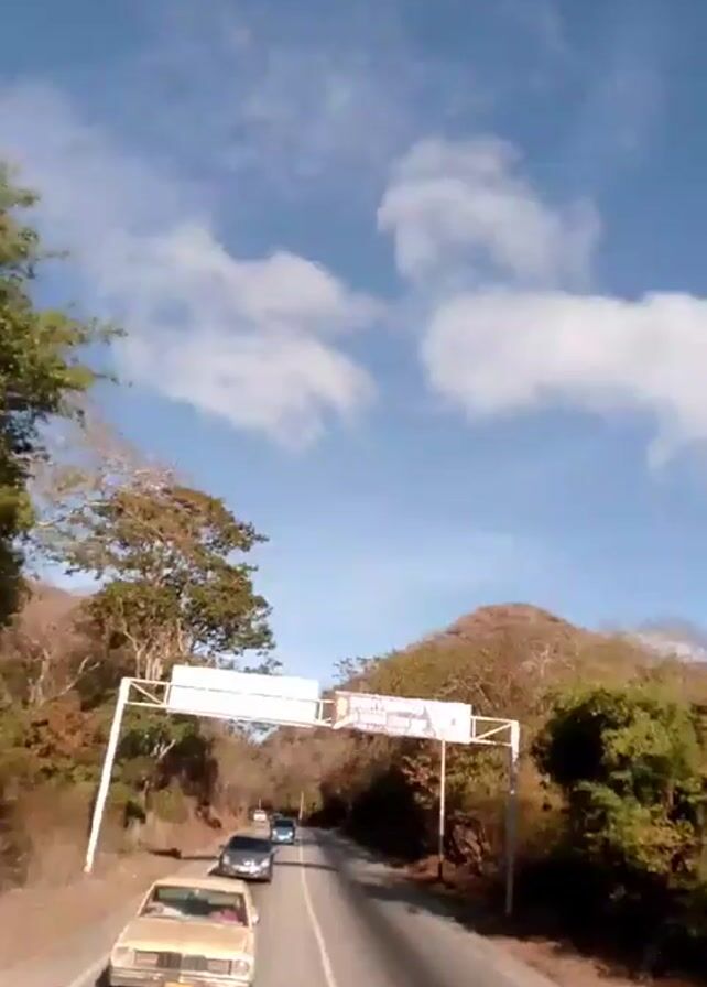 road trip on a paved road with sparse traffic, captured on a bright, sunny day. The sky is blue with puffy white clouds. A large welcome sign spans the road ahead. Cars including an older model tan car, and a green truck with an open back, are visible on the road. The road is lined with trees and arid hills in the background. The video appears to be taken with a mobile phone, as a "Infinix SMART 8" watermark is present at the bottom left corner of the screen.