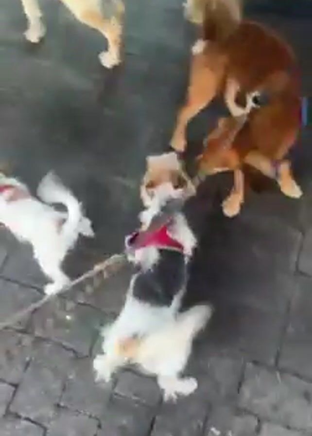 several dogs of different sizes and breeds on leashes on a brick sidewalk. There are two small dogs wearing red harnesses that are playing and jumping on each other. There is also a tan golden retriever-type dog and a brown dog with a blue harness standing around the smaller dogs. A person’s leg and sandal-clad foot are visible in the foreground. A metal bicycle is parked behind the dogs and a storefront with displayed merchandise is visible at the edge of the video.