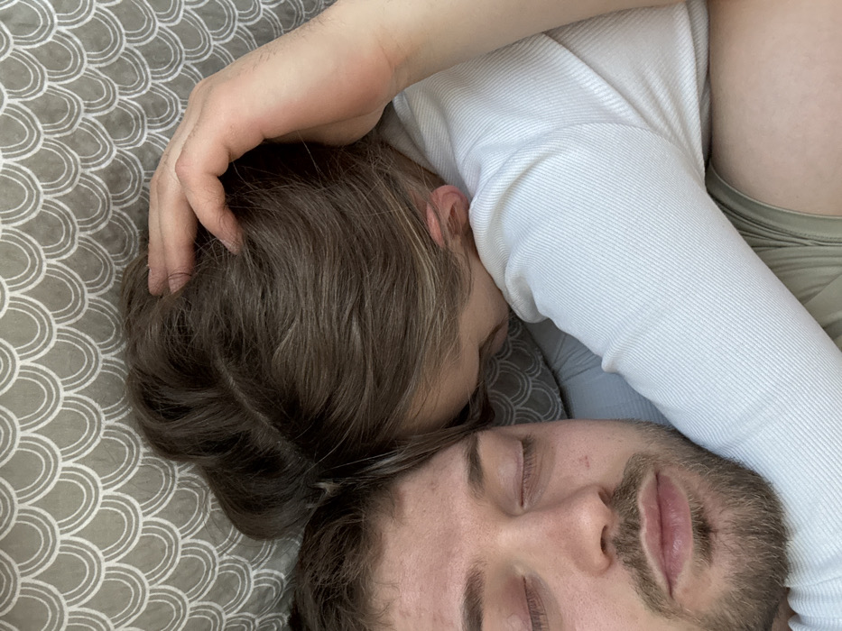 This image depicts two individuals in an indoor setting. The precise location within Sofia, Bulgaria, cannot be determined from the visual information provided. A male individual is positioned on the left, shown from the upper torso, facing upward with closed eyes. He has dark, short hair and a light-colored beard. A second individual is situated to the right, resting their head against the first individual's side or shoulder, with their face obscured and eyes closed. This individual has brown hair. Their right hand is placed on the first individual's head. They are dressed in a light-colored, ribbed long-sleeved shirt and light green shorts or underwear. Both individuals appear to be in a state of sleep or rest. They are lying on what appears to be a bed, against a pillow featuring a grey background with a repeating white scalloped pattern.