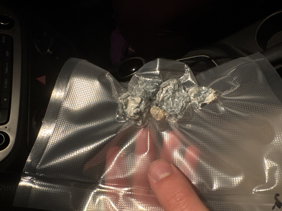three gray mushrooms in a clear, sealed plastic bag. The bag is being held by a person's finger. The mushrooms have a dense, textured appearance. The background reveals a car's dashboard with a console, buttons, and a reflective surface. The lighting is somewhat dim, casting shadows and reflecting light off the plastic bag.