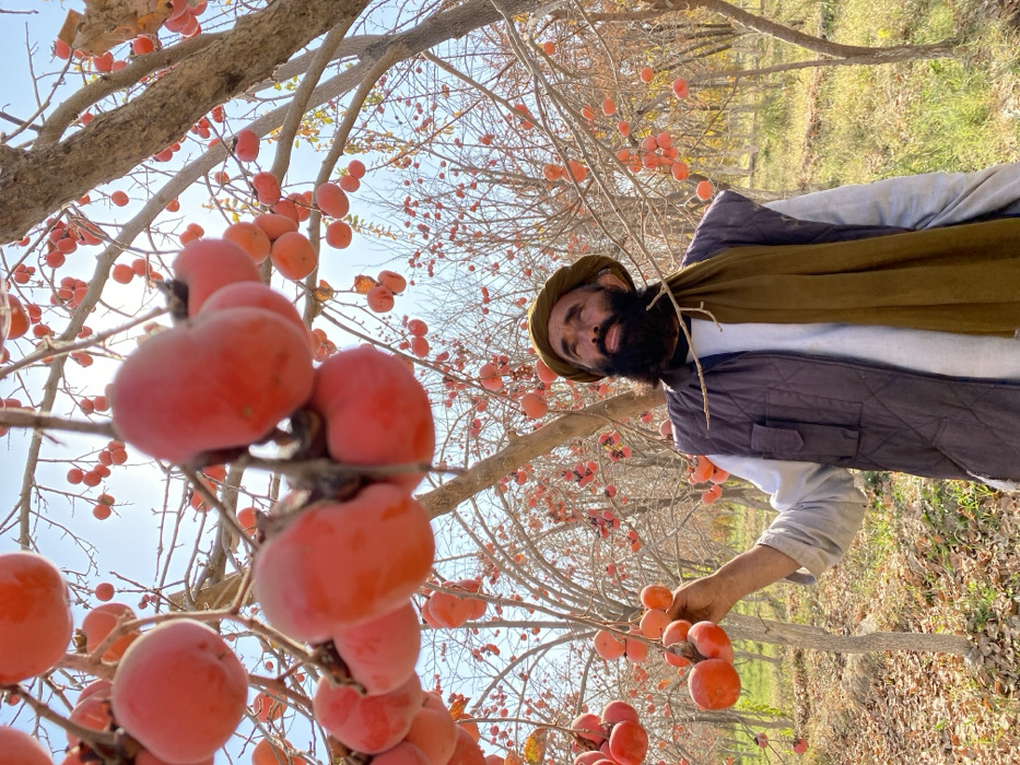 A man in a vest, light shirt, and head covering stands in a field of persimmon trees, their branches laden with bright orange fruit. He reaches out to touch a branch full of persimmons. The trees are bare, with a few leaves on the ground. The sky is a pale blue, and the sun is shining. The persimmons are the main focus of the image, with the man as a secondary element.