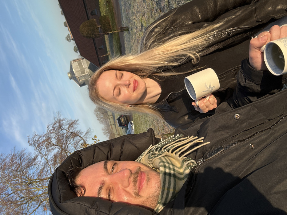A frontal outdoor photograph depicts two adults, a male and a female, in a frosted rural environment. The male, positioned on the left, has dark hair and stubble, wearing a black hooded jacket and a green and beige plaid scarf; he looks directly at the camera with a slight smile, holding a light-colored mug containing a green liquid in his right hand. The female, on the right, has long blonde hair and wears a black leather jacket; she holds a light-colored mug with a blue botanical design. Her eyes are closed, and she displays a faint smile, with her face oriented towards the low sun. The ground beneath them is covered in white frost. In the mid-ground, a dark SUV and a lighter-colored sedan are parked on the grass. The background features a distinctive circular building with a conical roof and an adjacent red-brick building with a tiled roof. These structures are identifiable as part of **Butley Priory in Butley, East Suffolk, United Kingdom**. Bare deciduous trees are visible against a clear blue sky, illuminated by low, golden sunlight.