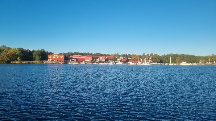 This panoramic image depicts a waterfront area in Västervik, Sweden. The lower half of the frame is occupied by a body of deep blue water with visible ripples, indicating a calm but dynamic surface. The middle ground showcases the developed shoreline. On the left, a dense line of green and partially autumnal trees forms a natural boundary, with a small, dark structure visible at the water's edge. Proceeding right, several large, red industrial-style buildings, consistent with warehouses or workshops, stand prominently on the shore. One such building displays a lighter square pattern on its facade. In front of these buildings, the shoreline appears rocky or reinforced, and a significant number of boats are present. These include numerous white recreational vessels, some with visible masts indicating sailboats, either docked in the water or stored on land along the embankment. The concentration of boats suggests a marina or shipyard area. Further to the right, the shoreline continues with more parked boats, transitioning back to a dense line of green trees. Faint outlines of smaller, lighter-colored structures are discernible within the trees on the far right. The upper half of the image is dominated by a clear, bright blue sky with no visible clouds. No human figures or discernible human interactions are present in the scene.