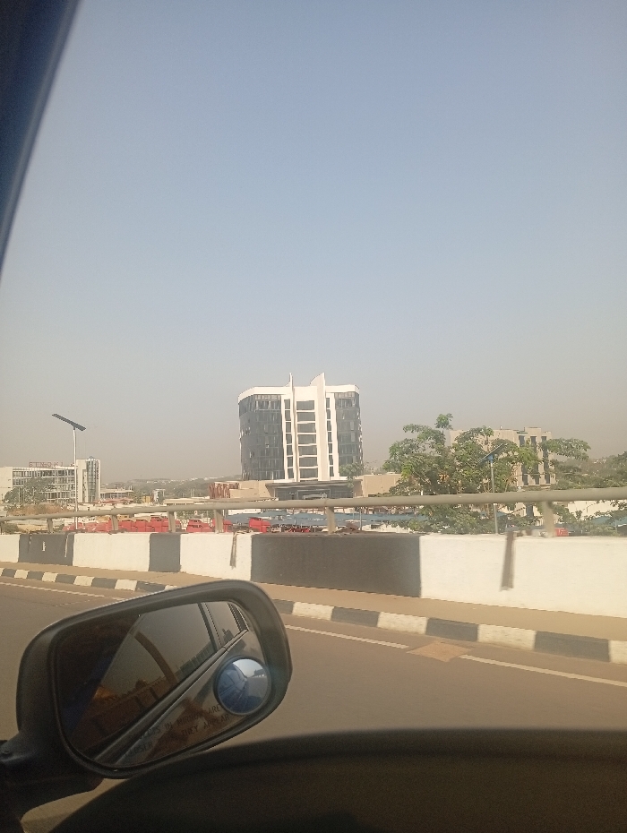 The image displays an urban landscape in Abuja, Nigeria, viewed from the interior of a vehicle