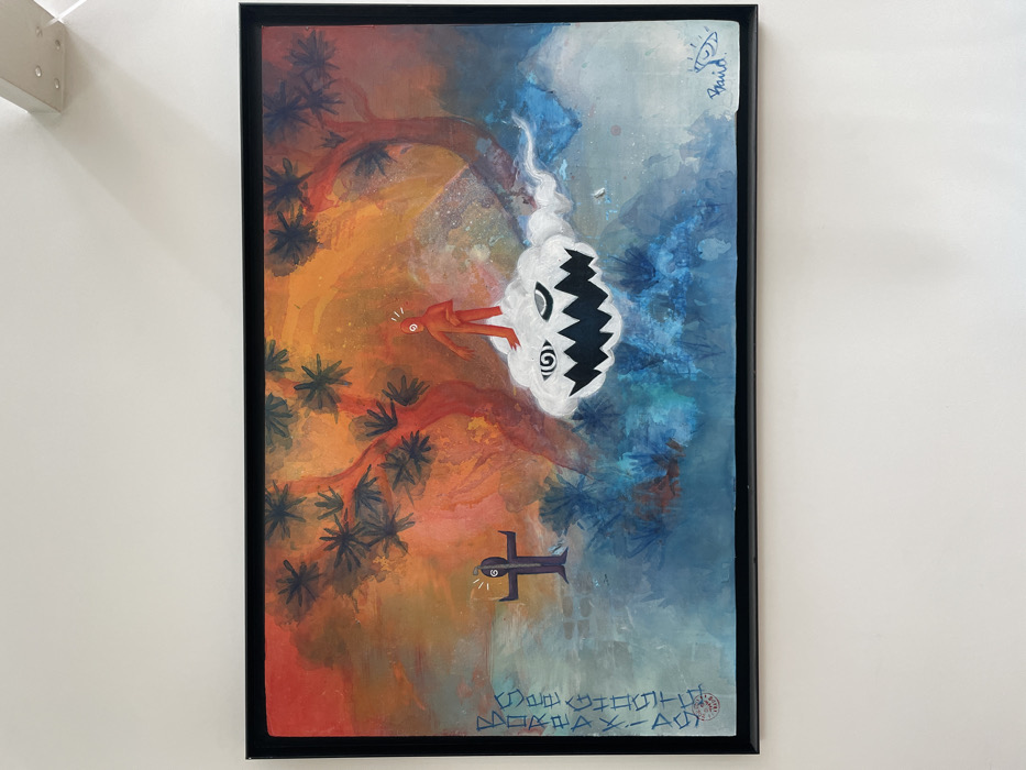 An artwork, specifically a horizontal mixed-media painting within a black frame, is affixed to a plain white wall in Saint-Denis, France. The painting depicts a surreal landscape with an upper section dominated by warm red, orange, and yellow hues, featuring two prominent red-trunked trees with dark, spiky foliage. The lower section presents a cooler environment with shades of blue, teal, and green, including dense, dark blue shrubbery. Two stylized humanoid figures are central subjects. On the left, a purple, T-shaped figure with a single white eye and radiating lines above its head stands on the blue ground with outstretched arms. On the right, a red figure with a similar eye and radiating lines stands atop a large, white, cloud-like entity. This cloud has a menacing expression, featuring two spiraling eyes and a wide, toothed black mouth. The cloud extends a wispy tail towards the right. Vertical blue text, reading "SODE GHOSTS BOREA KIAS" with a red circular stamp (possibly "2023") at its base, is visible along the left edge of the painting. A signature, "Haid" or "Hand," accompanied by an eye symbol, is located in the bottom right corner.