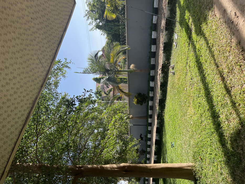 This image depicts an outdoor area within what appears to be a residential or institutional compound in Gura Top, Nigeria, viewed from beneath a patterned overhang