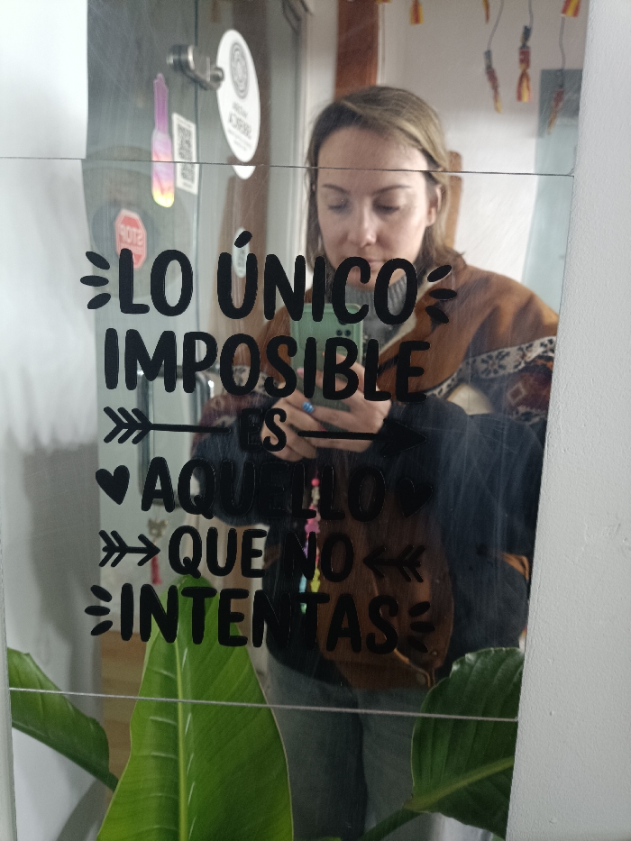 A light-skinned individual, appearing female with light brown hair, captures their reflection in a rectangular mirror within an indoor setting in El Port De Sagunt, Spain. The individual is wearing a grey high-neck top beneath a brown jacket featuring patterned shoulder and upper arm sections. They hold a light green smartphone with both hands, positioned in front of their chest, appearing to take a selfie. A blue ring is visible on a finger of the right hand. The mirror's surface displays smudges and scratches, along with a horizontal seam line. Black vinyl lettering is affixed to the mirror, reading "LO ÚNICO IMPOSIBLE ES AQUELLO QUE NO INTENTAS," accompanied by decorative arrows and dots. The reflection reveals a white wall, a wooden door with a visible handle, and various stickers including a red stop sign and a white oval logo. Small, colorful decorative elements hang from a string in the upper right background reflection. Large green plant leaves are visible in the lower foreground, reflected in the mirror.