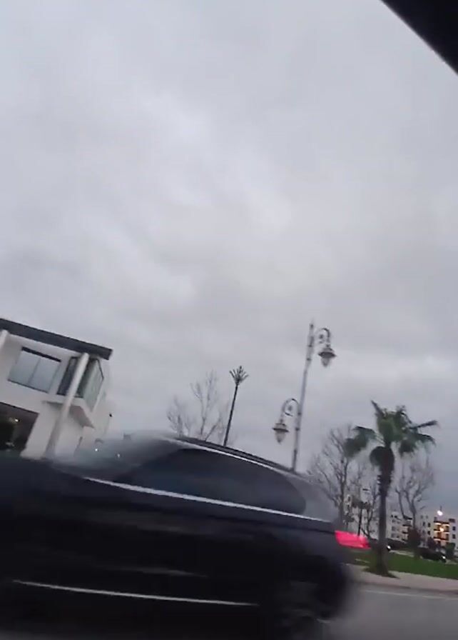 The view from a moving vehicle captures a street scene on a cloudy day. On the left, a modern white building with dark-framed windows stands beside a neatly trimmed landscape. A multi-lane road runs alongside a landscaped median that features palm trees, leafless trees, and green grass. White buildings of a similar architectural style line the background. Street lights with globe-shaped lamps are evenly spaced along the street. A dark-colored car passes in the opposite direction. The upper portion of the shot is framed by the vehicle’s interior, creating a partially obstructed view of the sky.