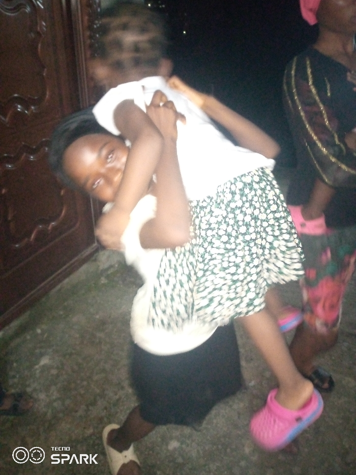 This image depicts a nighttime or low-light scene in Lokoja, Nigeria, featuring three individuals. In the foreground, a young female, possibly a teenager or young adult, with dark hair, wears a white short-sleeved top and a dark lower garment, with a light-colored slip-on shoe visible on her left foot. She is carrying a younger child on her back in a piggyback manner, facing the camera with a slight smile. The child, whose face is blurred, wears a white short-sleeved top and a dark green skirt with white floral or polka dot patterns, and a bright pink Crocs-style sandal with a blue sole on their left foot. The child's arms are wrapped around the neck/shoulders of the carrier. To the right background, an adult female is partially visible, wearing a dark top with gold embellishments, a pink headscarf, and patterned lower attire, with dark sandals on her feet. The ground is a grayish, textured concrete or tiled surface. A dark brown wooden door or panel with carved details is visible in the left background. The image bears a "TECNO SPARK" watermark in the bottom-left corner.