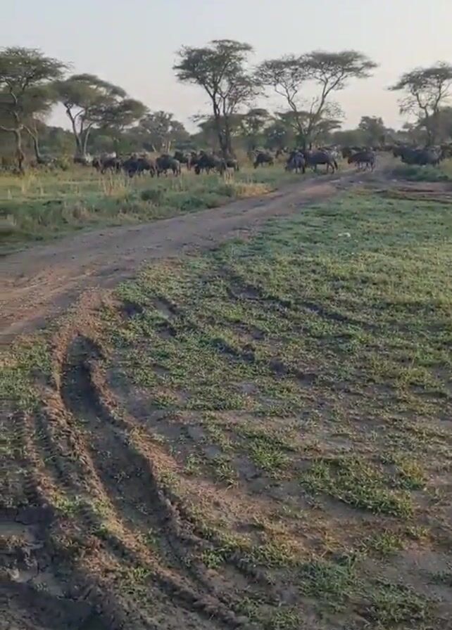 herd of gnus in an African savanna. They are standing and grazing in a grassy area with scattered trees. In the foreground, there is a dirt road with tire tracks. The sky is pale.
