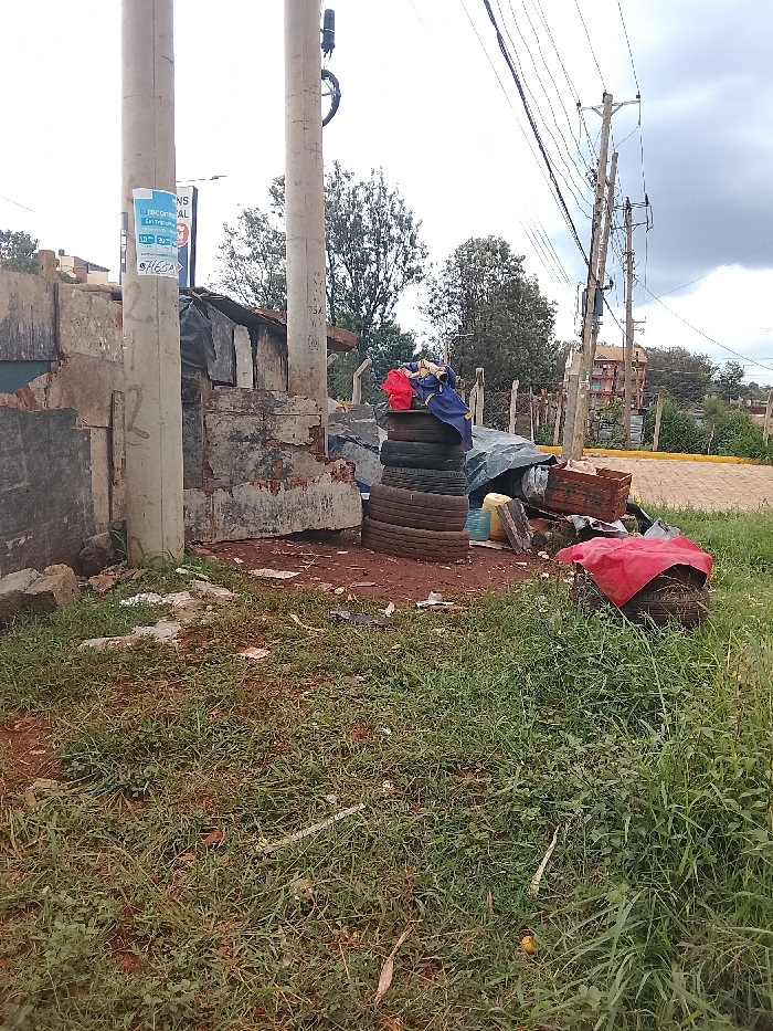 The image portrays an outdoor scene in Kiambu Township ward, Kenya, featuring urban infrastructure and an accumulation of discarded materials under an overcast sky