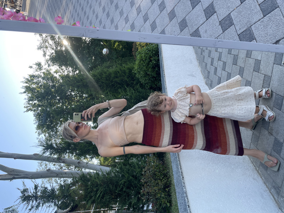 A full-length mirror selfie depicts an adult female and a juvenile female outdoors in Anapa, Russia. The scene is set on a paved surface featuring interlocking grey and beige blocks, bordered by a low, light-colored wall and dense green coniferous trees under a clear blue sky. A large, rectangular mirror with a white frame, adorned with pink floral elements on its right side, is positioned on the pavement, reflecting both individuals and the surrounding environment. The adult female, positioned on the left, wears a beige strapless crop top, a long vertically striped skirt in shades of red, brown, and cream, and light green flat sandals. She has light hair, wears brown-tinted sunglasses, and a dark band on her left bicep. She holds a light-colored smartphone in her right hand, angled towards the mirror to capture the image, and a light-colored shoulder bag is visible on her left shoulder. The juvenile female stands to the right of the adult, featuring curly light brown hair. She wears a light-colored two-piece outfit consisting of a ruffled crop top and a matching long skirt with a subtle pattern, and white sandals. She holds a pair of sunglasses in her hands, looking downwards and to the left. Bright sunlight is evident, casting reflections and a lens flare within the mirror, indicating a sunny outdoor setting consistent with a resort area in Anapa.