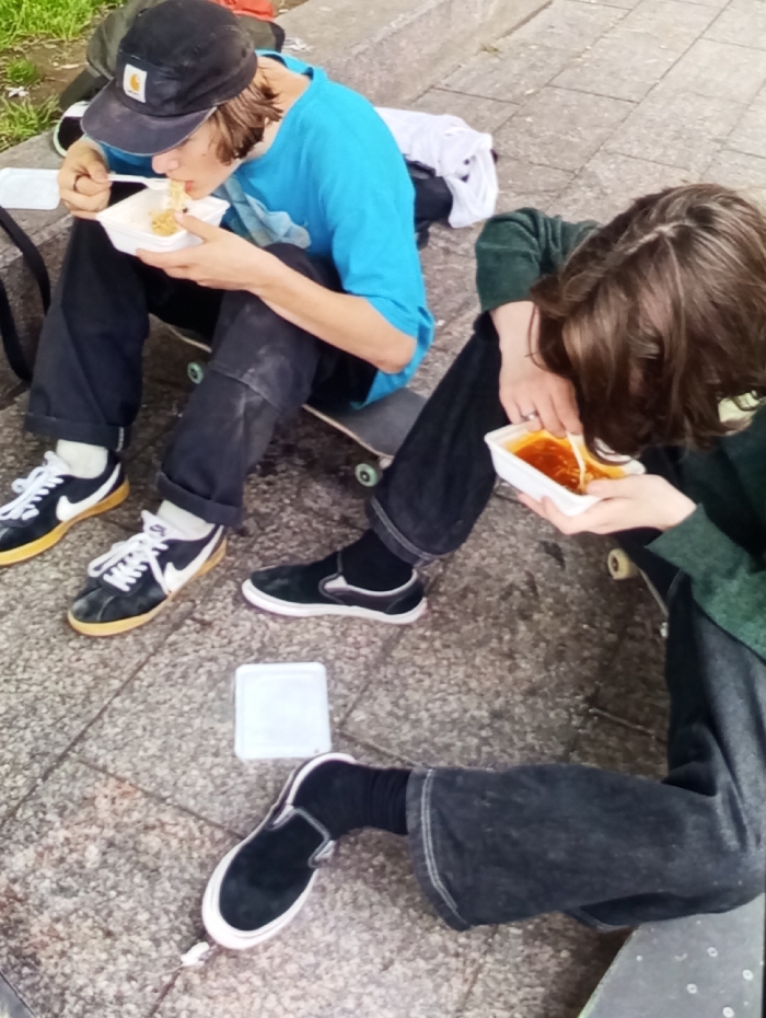 - "Two young individuals are seated on their respective skateboards on a grey, textured paved surface, consuming food from white rectangular takeout containers" by FM-1UPjC3, licensed under CC BY 4.0