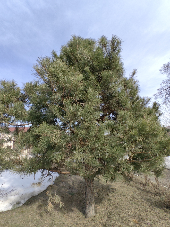 The image presents a single, prominent coniferous tree, specifically a pine, centered within the frame in Vidnoye, Russia. The tree exhibits a dense canopy of dark green needles and a visible brown trunk rooted in uneven terrain. The ground cover consists primarily of dry, light brown grass, with a substantial, melting patch of white snow occupying the lower-left portion of the frame. In the background, partially visible through the tree's foliage on the left, is a structure with a reddish-brown tiled roof and light-toned walls. To the upper right, the bare branches of a deciduous tree are visible. The sky is light blue with scattered, wispy white clouds, indicating clear weather conditions. No individuals or animals are present.