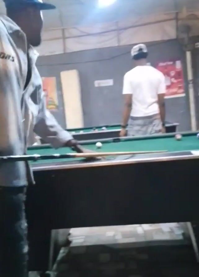 pool hall setting with three visible pool tables. Three men are present: one in the foreground wearing a grey jacket and a blue baseball cap, another in a white T-shirt and patterned shorts standing by the second pool table, and a third man wearing a brightly patterned shirt near the back. The man in the blue cap is taking a shot at the pool table closest to the camera. The pool hall has overhead lighting, a bare concrete floor, and posters on the walls. Another man in a yellow shirt is seen walking behind the first two tables.