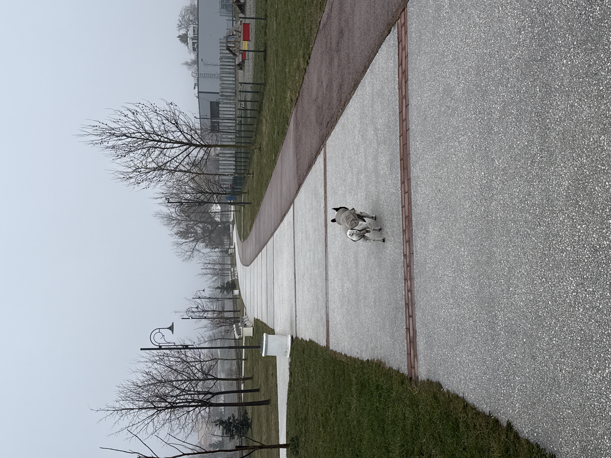 The image displays an outdoor scene within the city of Samokov, Bulgaria, under an overcast or foggy sky. A small, light-colored dog, wearing a grey coat and exhibiting dark markings on its head, walks away from the viewer on a wide, light grey aggregate-surfaced pathway. This pathway is segmented by reddish-brown brick lines and curves gently to the left in the distance. Parallel and to the right of the main pathway runs a narrower, darker reddish-brown track. The landscape is characterized by numerous bare deciduous trees, indicative of late autumn or winter, lining both sides of the main pathway. Scattered evergreen conifers are also present. The ground between the paths and trees is covered with green grass. Along the left side of the main pathway, ornate black streetlights and white park benches are regularly spaced. A white cylindrical object, appearing to be a waste receptacle or planter, stands near one of the benches. In the middle-ground on the right, a tall grey fence with vertical slats separates the park area from a children's playground equipped with colorful structures, including red and yellow elements. Beyond the fence, a large grey industrial-style building with a flat roof and various ventilation or structural components is visible. On the far left background, a partial view of a residential building with a tiled roof is discernible. No human subjects are present in the scene.