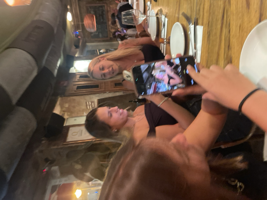 The image depicts an indoor scene within a dimly lit restaurant or bar, located in Unknown, Unknown. Three women are positioned at a rustic wooden table. In the center, a woman with light brown hair, wearing a dark off-shoulder top, holds a black smartphone horizontally, its screen displaying an image of two women holding drinks. She is looking towards the right, smiling slightly. To her right, a blonde woman in a dark top observes the phone screen. In the blurred left foreground, the head and shoulder of a third woman with brown hair are visible, with her hands in the lower frame, one of which appears to be holding the camera. The wooden table is set with white ceramic plates, silver forks, knives, and a wine glass. The background features exposed stone walls, dark wooden doors, framed items on the walls, and industrial-style ceiling ducts and speakers. Other patrons are visible as blurred figures in the deeper background.