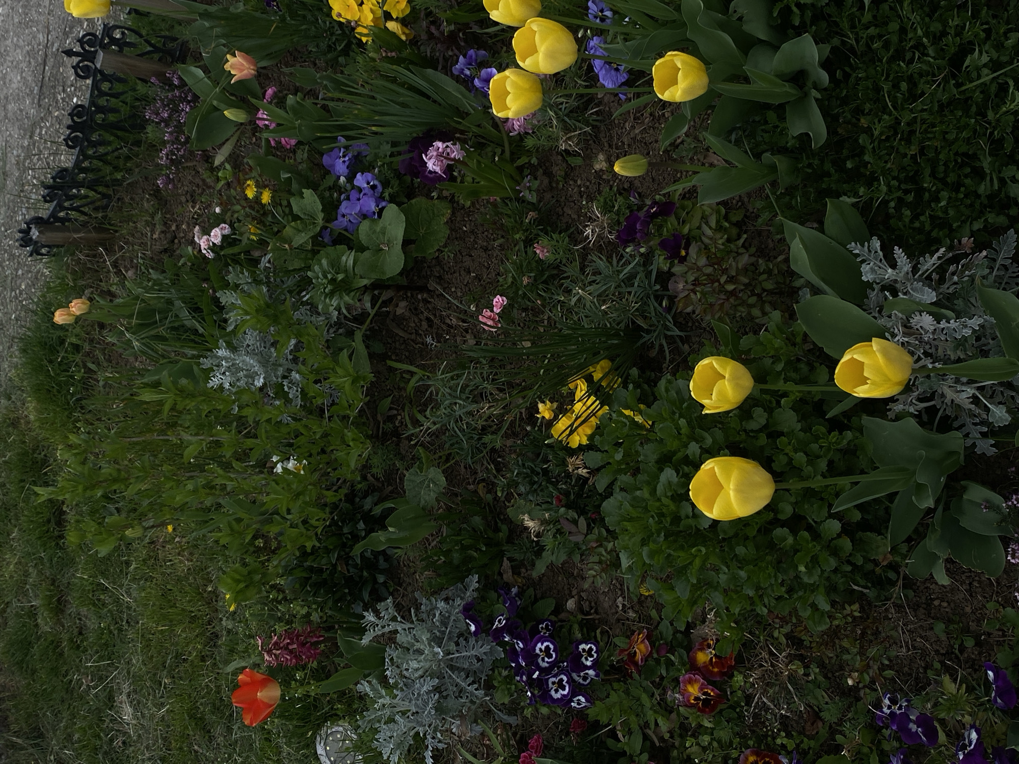 flower bed with a variety of plants, including yellow and orange tulips, pansies, and other greenery