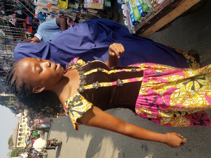 An outdoor scene in a busy market in Suleja, Nigeria, is captured during daylight. The foreground is dominated by a young Black female, slightly turned to her right, with her gaze directed downwards and to the right. She has braided hair styled with cornrows on top and a curly ponytail. She wears a vibrant, sleeveless dress featuring a dark brown velvet bodice adorned with three vertical strips embellished with black floral elements and small metallic accents. The shoulders and the full, gathered skirt of the dress are made from a fabric with a yellow, black, and pink abstract pattern, possibly large floral or leaf motifs. Her skin shows a natural sheen on her forehead and cheek. Immediately behind her, to the right, a person in a dark blue full-body garment (abaya or hijab) stands with their back to the camera, partially obscuring a man in a light blue polo shirt who is facing towards market stalls. To the far right, a wooden market cart displays various packaged goods, including small tubes labeled "MYT" and other items. Above the cart, numerous small brooms, plastic utensils, and other household goods hang from a display rack. In the mid-ground to the left, a bustling street scene unfolds. A man on a white motorcycle is visible, riding away from the camera. Numerous other pedestrians are present along the dusty street. In the distant background, multi-story buildings with arched windows and light-colored facades line the street, indicating a commercial area. The scene is illuminated by natural light, casting shadows on the ground.