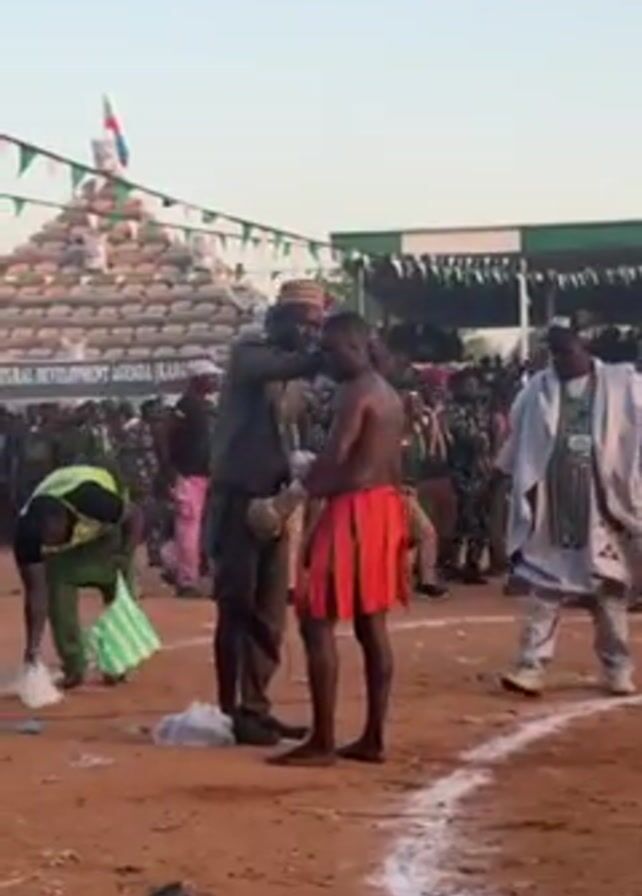 wrestling match preparation taking place in an outdoor arena. A shirtless wrestler wearing a red skirt-like garment is being attended to by a man in a dark-colored outfit, while a third man dressed in traditional white robes stands by. A person wearing a green reflective vest is tending to the ground in the foreground. The ground is a dirt arena marked with a white line. In the background, a large crowd is gathered, with a pyramid structure made of bags visible in the far distance. The scene is set in daylight.