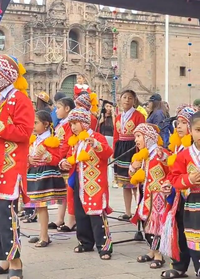 A group of children are performing on a stage in front of a stone church. The children are wearing traditional Peruvian clothing: red jackets with colorful embroidery, black pants or skirts, and intricately woven hats. Most are wearing sandals. They have yellow pompoms around their necks. One child holds a microphone. There are adults and other children in the background. The stage is decorated with Christmas garlands and a wreath. A sign identifies the event as the Santurantikuy Feria De Cusco, which is a Christmas fair.
