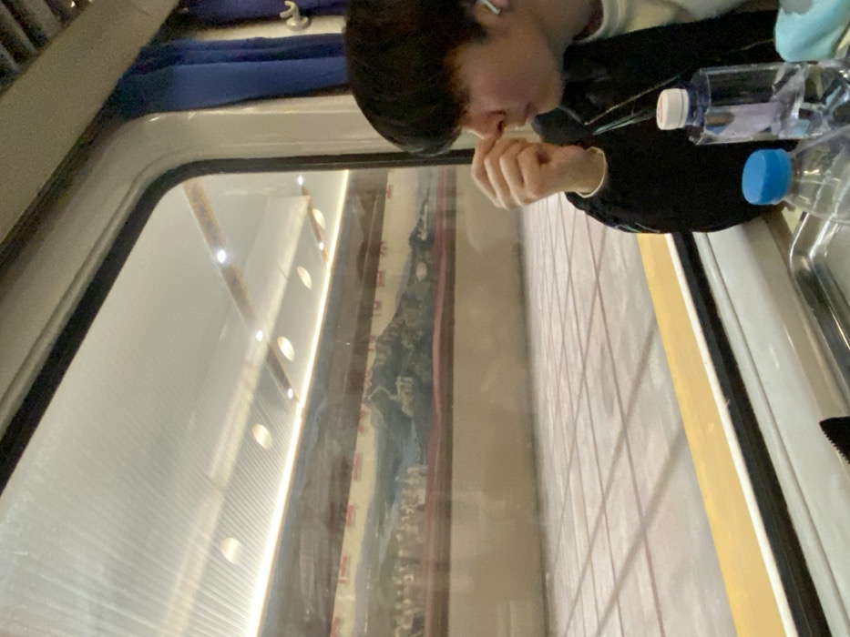 The image captures an interior view from a train car stopped at the Beijing Railway Station in Dongcheng District, China. A young East Asian male, with short dark hair, is positioned in the right foreground, seen from the chest up, looking out the train window to the left. He is wearing a dark jacket over a lighter garment, and his right hand is raised, with fingers contacting his upper lip or nose. A white wireless earbud is visible in his right ear. On the table or windowsill in front of him, a metallic tray holds two plastic water bottles: one larger clear bottle containing water and one smaller bottle with a blue cap, also containing water. A blue curtain is partially visible to the right of the window frame. Beyond the train window, an indoor railway platform is visible. The platform floor is composed of light-colored square tiles, forming a distinct grid pattern. A large mural spans the wall opposite the train. This mural depicts a mountainous landscape, potentially including features resembling the Great Wall, with a group of figures gathered on the left side. Red banners or text are present along the upper edge of the mural. Above the mural, the station wall is a uniform light color, and the ceiling features a corrugated or ribbed design illuminated by multiple circular recessed lights and linear strip lighting fixtures.