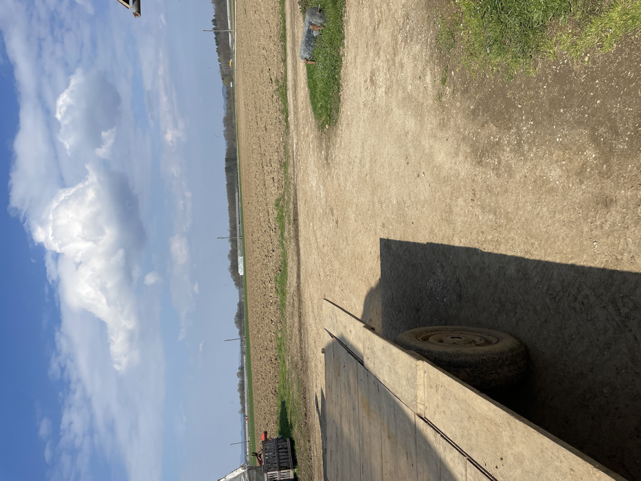 The image presents an outdoor agricultural scene under a bright blue sky with prominent white cumulus clouds. In the immediate foreground, a weathered wooden flatbed trailer with a single visible dirty wheel is positioned in the lower-left, extending towards the center. It casts a distinct, elongated shadow onto the light brown, gravelly dirt path that dominates the foreground and midground. To the right of the path, a small patch of green grass is visible, containing a dark, cylindrical object that rests partially embedded. Beyond the trailer to the left, a white tarp-covered structure, a section of red agricultural machinery, and stacked wooden crates are present. The central and right midground consists of extensive tilled brown earth fields, with some greener cultivated areas further in the distance. Several utility poles are sparsely distributed across the distant fields. The background features a low horizon line with trees and a range of low-lying hills or mountains. To the far right, multiple elongated white structures, indicative of greenhouses or polytunnels, are discernible. No individuals or overt actions are present. The scene is situated within an agricultural zone on the periphery of Krško, Slovenia, consistent with farming properties in the Lower Sava Valley region.