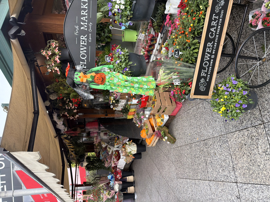 A vibrant outdoor flower market is depicted on a grey paved sidewalk, likely in a commercial area of London, United Kingdom. The market operates under a beige, scalloped-edge awning extended from a building facade. A black sign with white text, partially visible, reads "Fresh FLOWER MARKET Open Daily." The scene is elaborately decorated, featuring a prominent, life-sized green scarecrow-like figure. This figure, dressed in a green polka-dotted suit with an orange pumpkin motif on its chest, wears a black witch's hat adorned with metallic mesh. The presence of this figure and several orange pumpkins strongly suggests an autumn or Halloween seasonal display. Numerous floral items are arranged for sale: * To the left, bouquets of various fresh flowers, wrapped in paper and plastic, are displayed upright in black buckets on tiered stands. * Towards the center and right, an extensive array of potted plants, including colorful pansies, violas, and plants with red and orange berries or flowers (some marked with "£12" price tags), are meticulously arranged in black pots and stacked wooden crates. Several orange pumpkins are also visible within these displays. * In the immediate foreground, a black, spoked "FLOWER CART" displays additional potted flowers. A sign on the cart reads "PICK YOUR OWN & WE CAN PICK THEM FOR YOU!" A black pot containing purple and yellow pansies sits beside the cart. The sidewalk consists of textured grey paving stones. In the background, to the far left, a modern building with red and grey commercial signage (partially visible, including "POP-UP SHOP LONDON") indicates an urban setting. No individuals are present within the frame, and no actions or interactions are depicted.