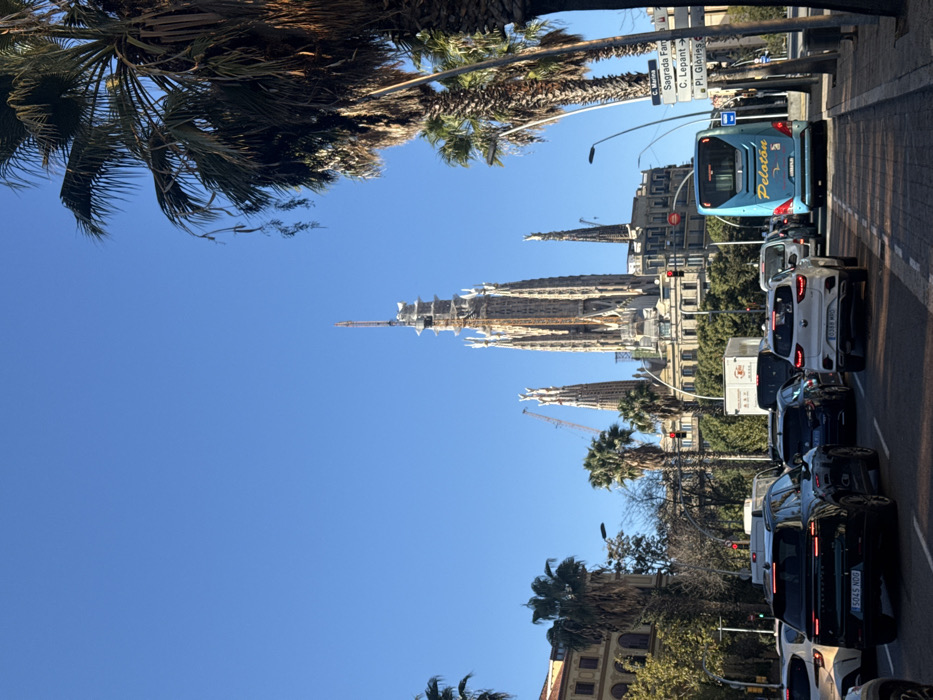 - "The image displays a daytime urban street scene in Barcelona, Spain, with the Sagrada Familia basilica prominently featured in the background under a clear, bright blue sky" by FM-zzfgm1, licensed under CC BY 4.0