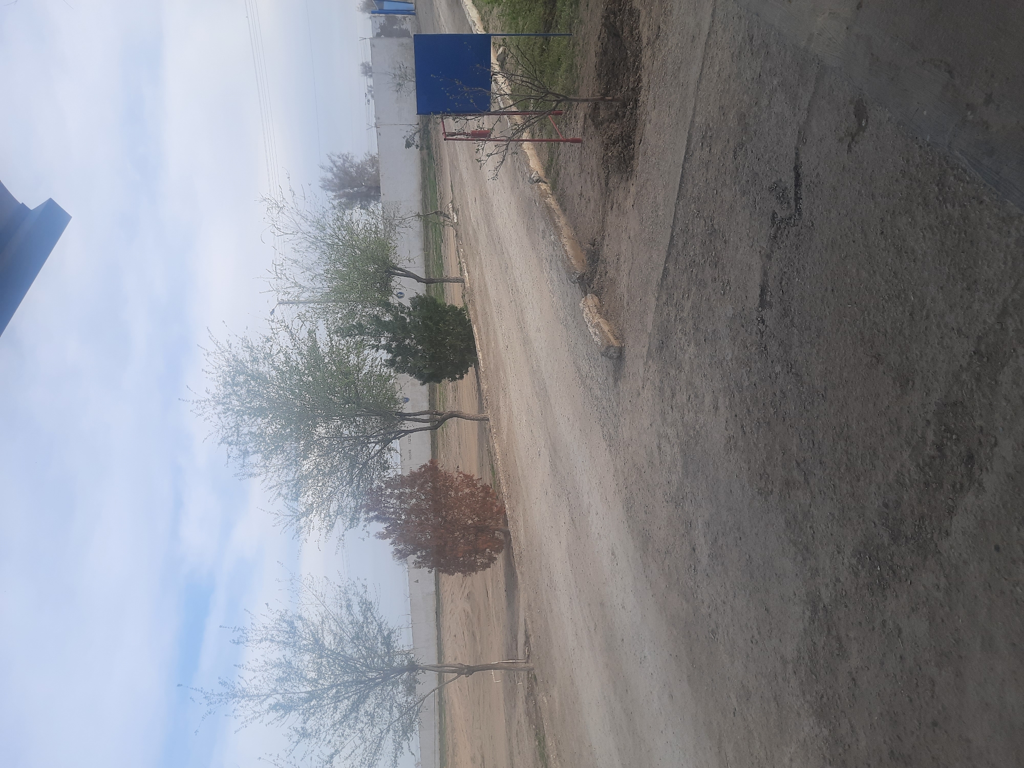 The scene depicts an unpaved, dirt road curving through a semi-arid outdoor environment under a partly cloudy sky in the city of Unknown, Unknown. No individuals are present. The foreground is dominated by a dark, uneven dirt surface consistent with an unpaved road or path. On the right, a broken concrete curb separates the path from a patch of disturbed earth where a small sapling, supported by a red metal frame, stands next to a small, dark blue rectangular panel. In the midground, the dirt path continues to curve towards the left. Multiple trees are sparsely distributed: a light green-leafed tree on the far left, a reddish-brown evergreen-type tree near the center, and several other light green-leafed and denser green shrub-like trees further back. The ground beyond the immediate path is barren, light brown soil. The background features a long, low white concrete wall topped with barbed wire, running horizontally across the frame. Behind the wall, faint power lines are visible against the light blue sky, which has scattered white clouds. A dark, angular object is partially visible at the top center of the image.