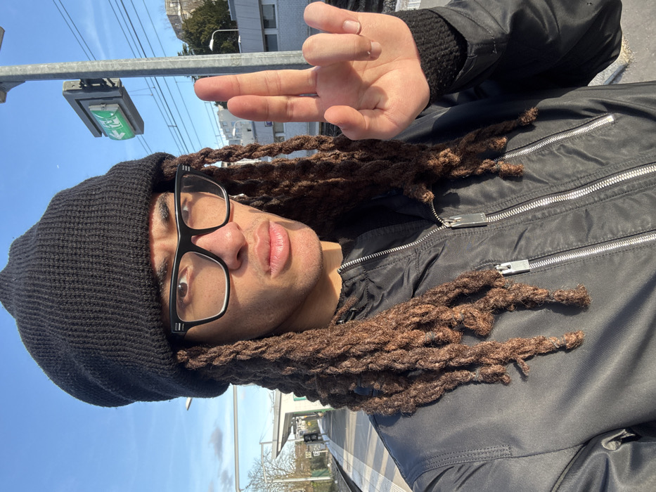 A person with dreadlocks and glasses poses in a selfie. The person is wearing a black beanie and a black jacket with multiple zippers. They're making a hand gesture, holding up their index and middle fingers, with the rest of the hand out of frame. Behind them, there is a street light, buildings, and a blue sky. The photo seems to be taken outdoors during daylight, near a train platform.