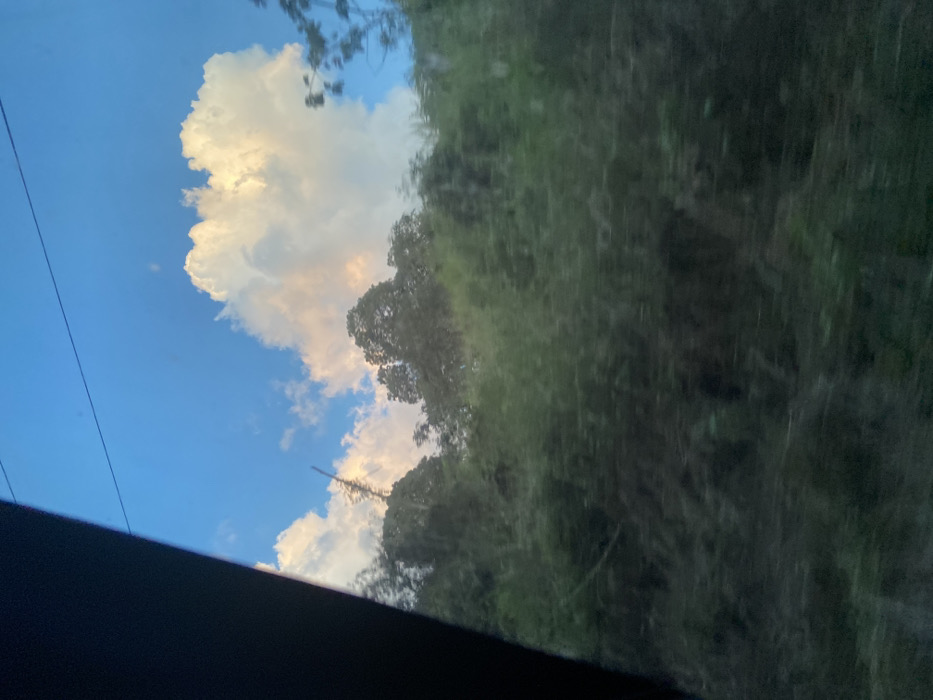 The image captures a natural landscape scene, likely viewed from a moving vehicle, in Parroquia Caucagua, Venezuela. A dark, angled structural element, consistent with a vehicle's interior window frame or pillar, partially obstructs the left side of the frame. The central and lower portions of the image feature a dense, verdant hillside or forested area, characterized by varied green foliage and exhibiting motion blur in the foreground, suggesting movement during capture. A prominent, tall, slender, bare tree trunk or branch extends upwards from the vegetation line on the left side. The upper third of the image displays a clear blue sky with large, white cumulus clouds, some illuminated with subtle orange-pink tones. Two thin, dark horizontal lines, consistent with overhead utility wires, are visible traversing the sky. No individuals or man-made structures beyond the implied vehicle and utility lines are discernible.