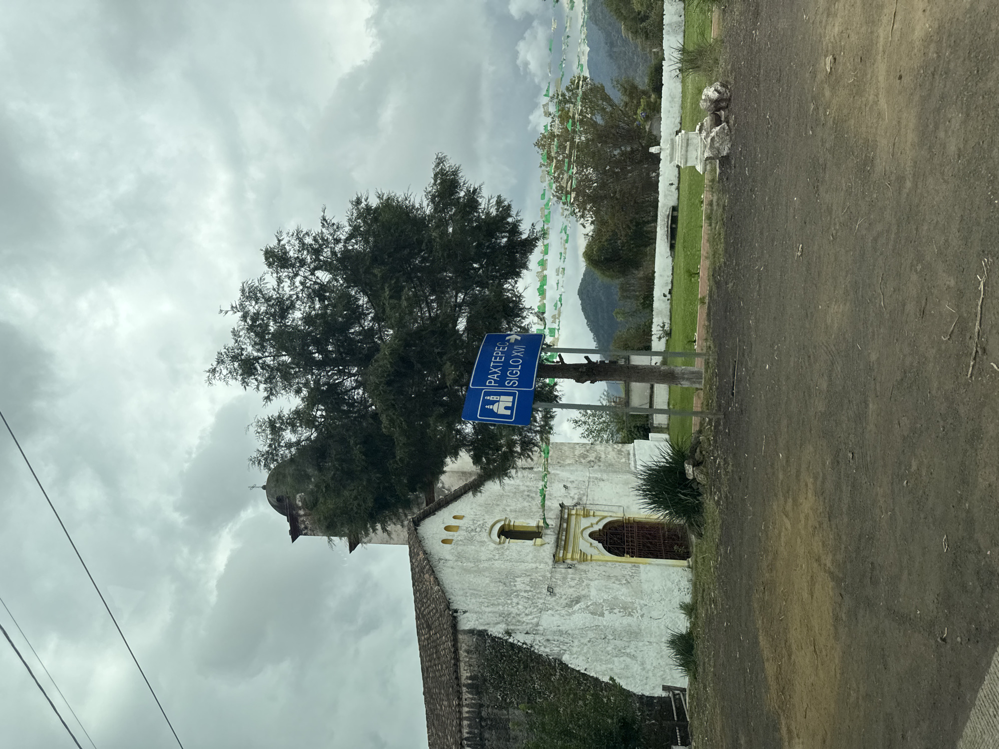 Iglesia Paxtepec in Coacoatzintla, Mexico on an overcast day. A blue road sign with an arrow pointing to the right reads "Paxtepec Siglo XVI" (Paxtepec 16th Century) and displays a drawing of a church. A large, leafy tree partially obscures the view of the church, which is a light-colored building with a brown tiled roof. An ornate window and doorway are visible. Strings of green and white decorations are hung above the church. A small white wall is in the background, with green grass in front of it. Mountains are visible in the distance behind the decorations. A dirt road is in the foreground. Electrical wires run across the top left of the frame.