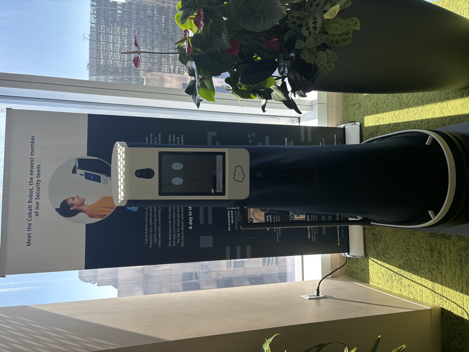 The image displays an indoor scene within a high-rise building, characteristic of an office environment in San Francisco, United States of America. A tall, cylindrical Cobalt Robot security unit stands centrally on a dark charging base, connected by a black power cable to a white wall outlet embedded in a light beige wall on the left. The robot features a dark blue body, a white top panel with a perforated grid pattern, and a central screen displaying two blue ovoid shapes resembling eyes, along with a white cloud icon and speaker symbol. A small camera lens is visible on its upper white section. Behind the robot, a vertical white banner with dark blue text advertises, "Meet the Cobalt Robot, the newest member of our Security team." The banner includes a circular graphic depicting a woman interacting with a similar robot and explanatory text about the robot's functions, such as security patrols, anomaly detection, and two-way communication. To the right of the robot, a large dark gray planter contains lush green plants with prominent red Anthurium flowers. The floor is covered with a bright green carpet. Large windows behind the banner and plant reveal a clear daytime cityscape, showcasing multiple modern high-rise buildings under a bright sky, consistent with an urban financial district. No people are present in the scene.