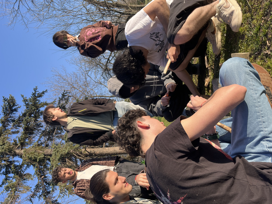 Seven young adult males are gathered outdoors in a park setting within the city of Sofia, Bulgaria, under a clear blue sky with strong afternoon sunlight. The ground is a mix of sparse grass and bare earth. Mature evergreen trees and deciduous trees with bare branches are visible in the background. Three individuals are actively engaged in whittling pieces of light-colored wood with small knives or tools. In the foreground, a man with dark curly hair, wearing a black t-shirt and blue jeans, sits cross-legged, whittling a stick held against his left leg. To his right, a man in a white t-shirt with a graphic print and dark shorts crouches, whittling a longer piece of wood. Further to the right, partially obscured, another man in a grey hooded sweatshirt (bearing "ALL-NIGHT TECHNO DJ" text) is also crouched and whittling a stick with an orange-handled knife. Observing these activities are three other men. To the left of the whittling group, a man with long dark hair tied back, wearing a plaid shirt over a white t-shirt, smiles while looking downwards. A green glass bottle rests on the ground near him. Behind him, another man with curly light brown hair, dressed in an open plaid shirt and white t-shirt, stands facing right. In the background center, a man in a black jacket and light green t-shirt stands with his mouth open, appearing to be speaking. To his right, a seventh man with dark hair and dark rectangular sunglasses stands, wearing a brown sweatshirt with a pink graphic and dark pants, holding a small object near his mouth.