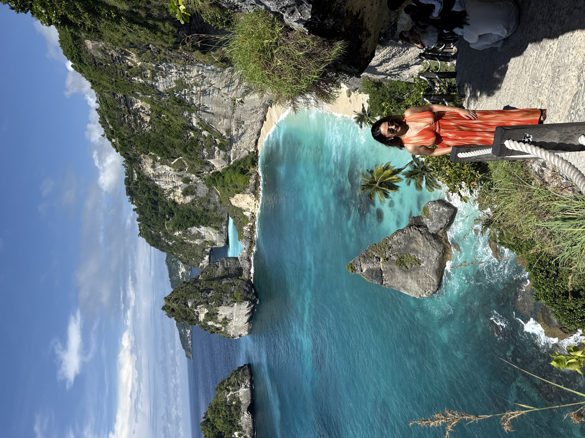 vertical view of a scenic landscape in Pejukutan, Indonesia. Dominating the scene is a turquoise bay with rocky cliffs and verdant vegetation. A woman in an orange dress and sunglasses stands near a wooden railing along the edge of the cliff, posing for the camera. Palm trees are near the edge of the bay. The sky is blue with some clouds. In the distance, rock formations jut out of the sea. The turquoise water contrasts with the gray rock formations and the sandy beach.