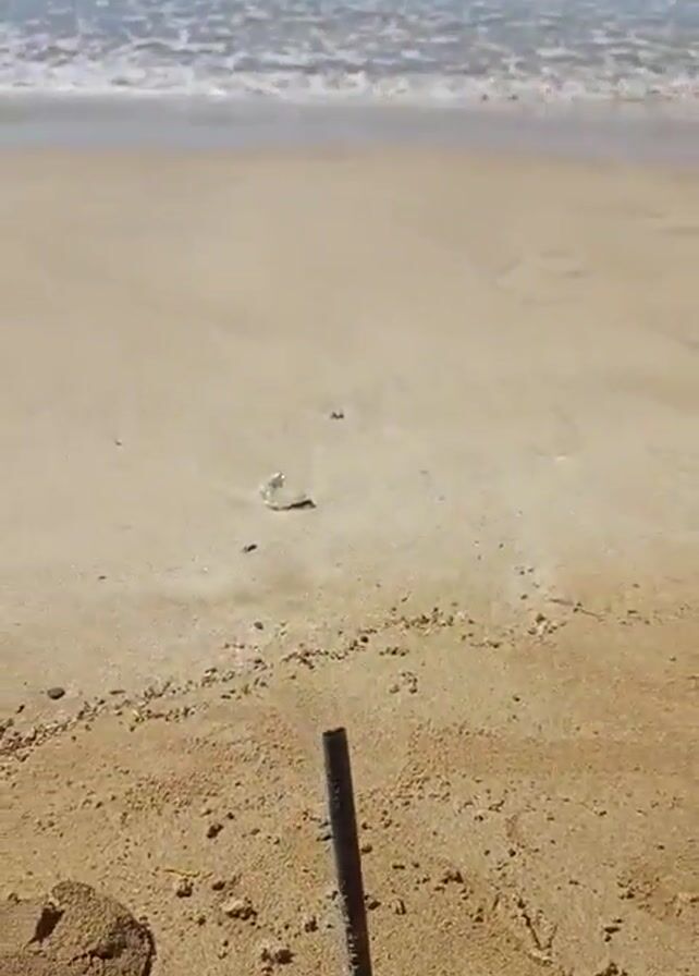sandy beach on a sunny day. The camera is initially focused on a metal rod stuck in the sand. It then pans up to show the ocean, with gentle waves rolling onto the shore. A rocky breakwater is visible in the distance, as well as a large ship on the horizon. The camera then pans back down to the sand.