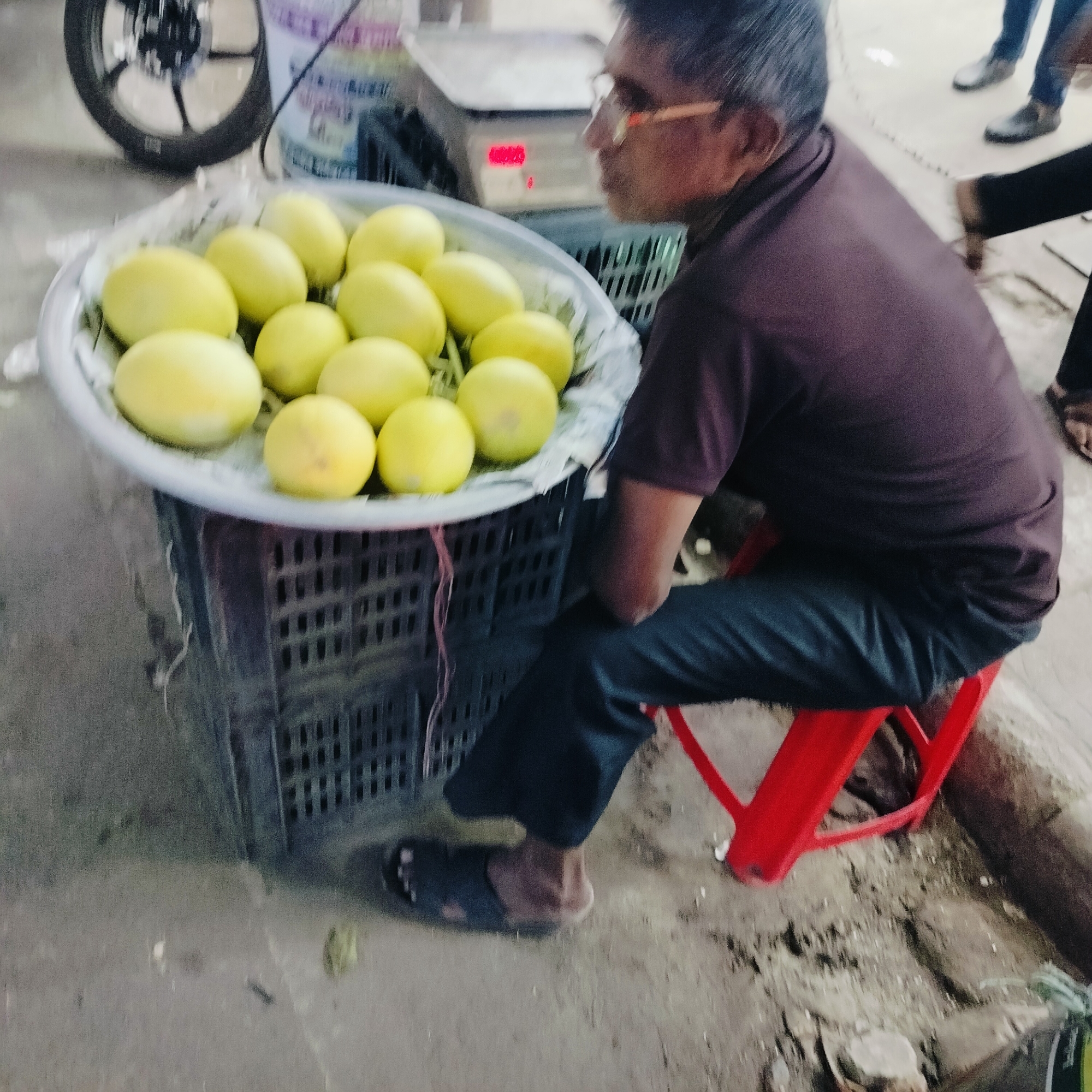 An overhead-angled photograph captures a street vendor scene in Bhola, Bangladesh. In the foreground, a man with graying hair and glasses, wearing a dark short-sleeved shirt and dark pants, is seated on a red plastic stool. He wears dark sandals. To his left, a large, shallow white tray contains approximately 15 bright yellow, oval-shaped fruits, possibly melons, resting on a dark, rectangular, perforated plastic crate. Behind the fruit display and the man, an electronic weighing scale with a red digital readout displaying "0.000" is visible. Further back, part of a black motorcycle or bicycle wheel is present on the left. On the right side of the frame, the lower legs of at least two other individuals are visible, one wearing dark shoes and light pants, and another in dark shoes and dark pants. The ground is a light-colored, uneven concrete or paved surface with scattered debris.