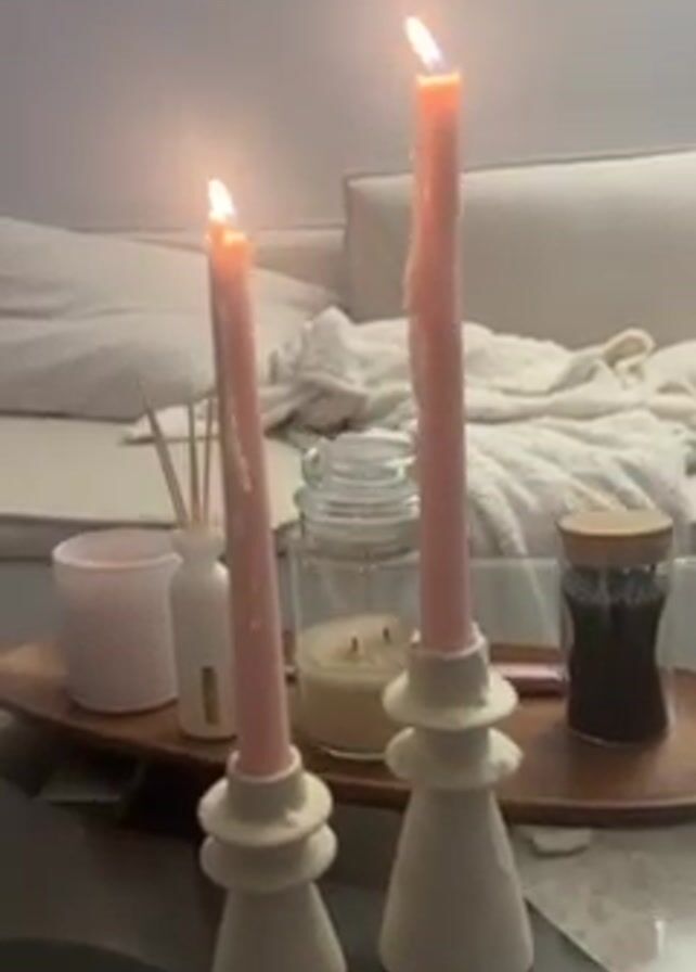 living room scene on a glass coffee table. Two lit pink candles sit in light-colored, ornamental candle holders. Behind them is a wooden tray holding a small pink candle, a reed diffuser, a large glass jar candle, and a dark container with a wooden lid. A white couch with rumpled white blankets and pillows is in the background. Music is playing.