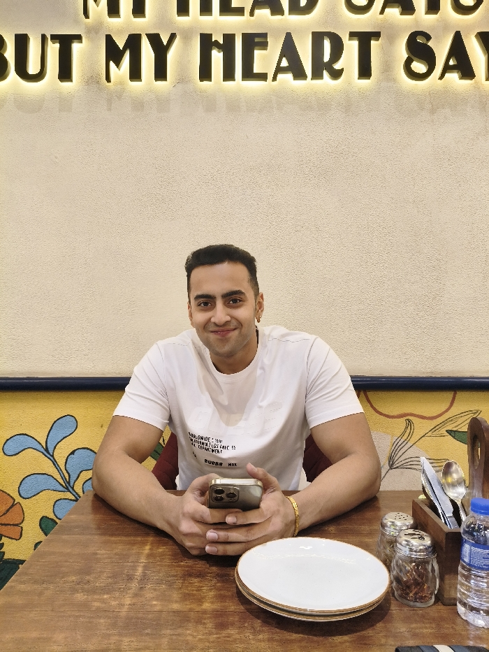 A male individual is seated at a wooden table within Flurys, a restaurant located in Kolkata, India. The subject, an adult male in his late 20s to early 30s, possesses short dark hair, a trimmed beard, and wears a white graphic t-shirt. He has a silver-colored earring in his left ear and a gold-colored bracelet on his right wrist. Both hands are clasped around a gold-colored smartphone, resting on the table. He faces forward, looking at the camera with a slight smile. The table surface displays a stack of two white plates with gold rims, two clear glass shakers (one containing spices, the other chili flakes), a wooden caddy holding assorted cutlery and white napkins, and a plastic water bottle. The background consists of a textured beige wall featuring a partial backlit sign with dark raised letters reading "MY HEAD SAYS" on the top line and "BUT MY HEART SAY" on the bottom line. Below this sign, a horizontal blue stripe separates the beige wall from a lower section painted yellow, adorned with abstract blue and orange floral patterns.