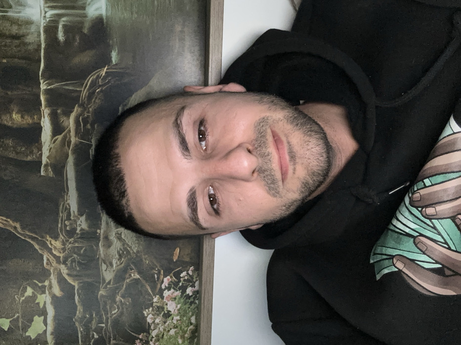 The image depicts a single male individual in an indoor setting. No visual information in the image identifies the specific location as being within the city of Slavyani, Bulgaria. The male, appearing to be in his late 20s to early 30s, is positioned centrally, facing directly towards the camera. He possesses short, dark hair and a closely trimmed beard, with brown eyes. He is wearing a black hooded sweatshirt. On the lower left front of the sweatshirt, a graphic design features two hands, depicted with a medium-brown skin tone, holding a stack of green objects, consistent with banknotes or leaves. Behind the individual, a framed piece of wall art is visible, portraying a natural landscape scene. This artwork features large tree roots, foliage including light-colored flowers in the foreground, and a waterfall or flowing water element on the right side. The frame of the artwork is light-colored, possibly wood. The background wall is white or light-colored, and the lighting is even across the subject's face. No other individuals or significant actions are depicted.