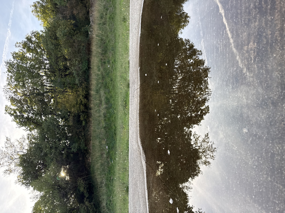 A landscape divided by a gray path. To the left is a grassy field and lush trees, one with sunlight peeking through. The right side is a reflection mirroring the left, distorted by water. Streaks across the reflective surface suggest sky or clouds. Debris floats on the water, adding texture to the mirrored scene.