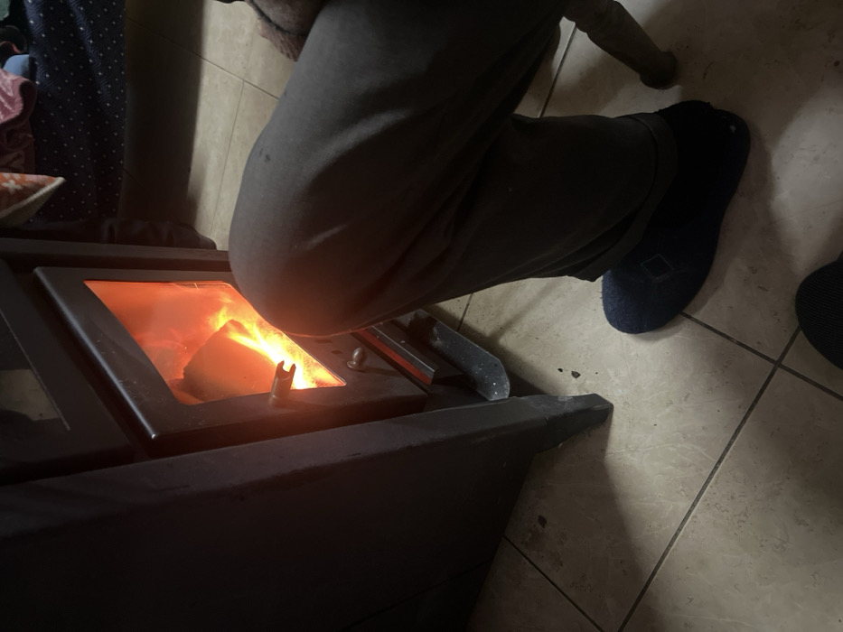 A person kneels near a dark, metallic wood-burning stove with flames visible inside. The person wears dark grey sweatpants and navy blue socks. The floor is tiled in a light beige color. Part of another person's legs, clad in navy blue polka-dotted pants, can be seen to the left of the stove. Another dark object, possibly a shoe, is visible on the right of the frame on the floor.