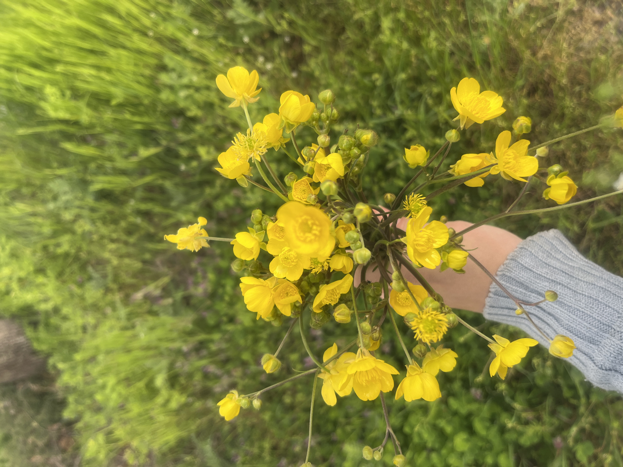 The image presents a bouquet of yellow buttercup flowers held in a hand wearing a light blue sweater. The flowers are in full bloom with some buds. The background is a blurred field of green grass, suggesting a natural setting. The image does not contain any clues to identify the exact location as Yasna Polyana, Bulgaria.